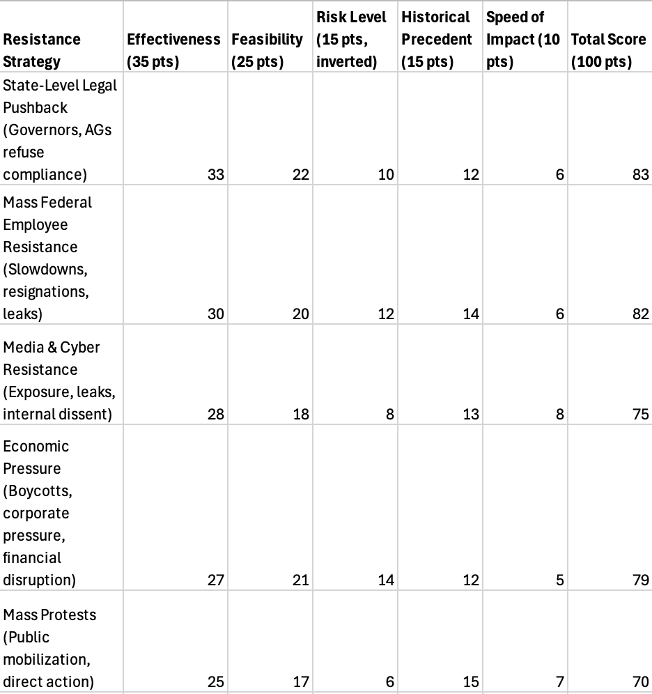 I have been working on building a Resistance Effectiveness Framework - a structured way to evaluate different resistance tactics based on effectiveness, feasibility, risk level, and historical precedent. The idea being “Given a Trump action, what resistance action would be most effective against it?”