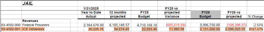 The Jail Fund totals $7,928,805.87. Of that, $2,131,600 is projected to come from ICE detainees. Last year, ICE revenue was just over $22,000.